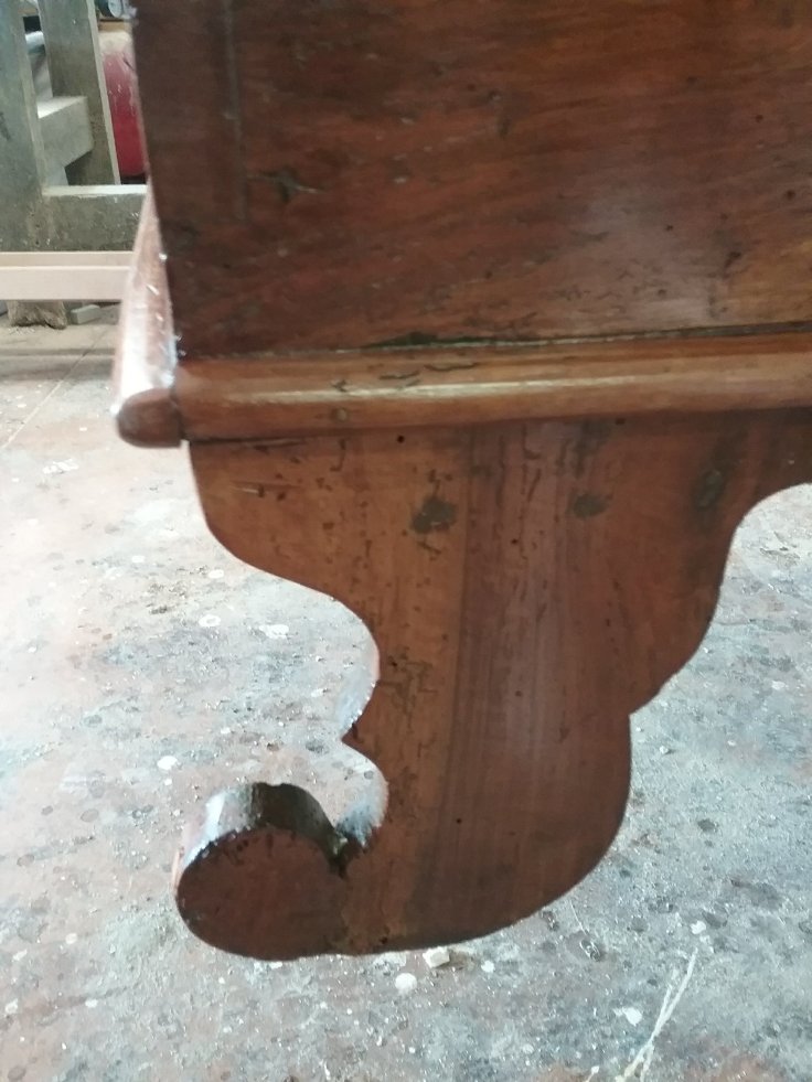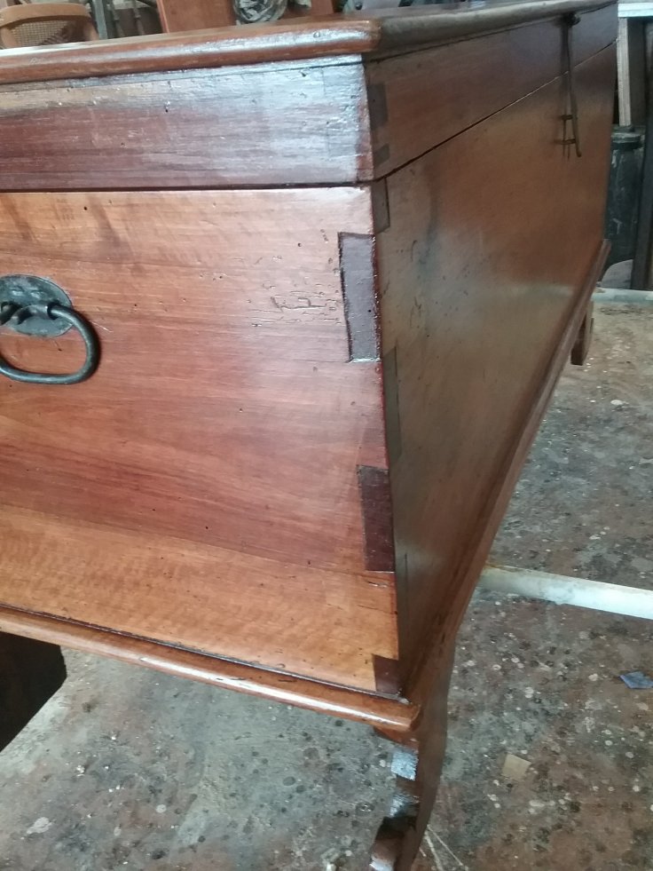 Questa cassapanca risale agli anni 20 dell’Ottocento e presenta dei rifacimenti e delle integrazioni, visibili nei piedi, nei chiodi e in una fascia. Probabilmente il rifacimento dei piedi è stata necessaria a causa di acqua o aggressione da parte dei tarli.