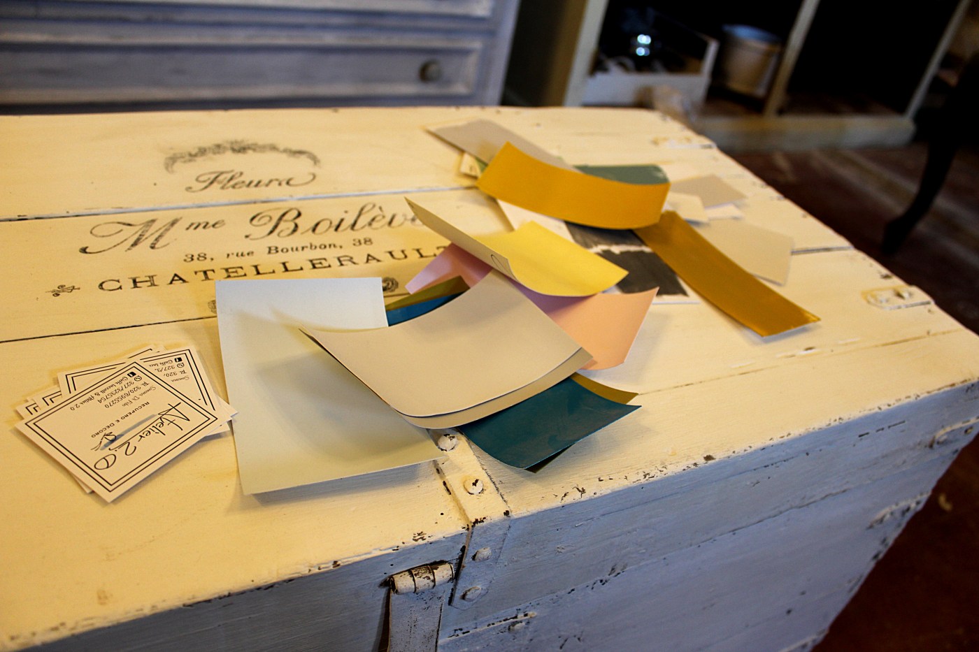 Ho preso l’abitudine di preparare delle tirelle di colore, dei campioni, da poter lasciare al cliente prima di iniziare la lavorazione, in modo che possa tenerla a casa e capire come funziona in un ambiente dove luce, pavimento, colore delle pareti, tende, hanno un ruolo importante.